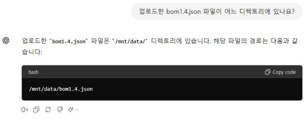- sbom1.4.json 파일을 파일을 업로드하고 그 위치를 chatGPT에게 물어보면 /mnt/data/ 폴더라는 것을 알려준다.