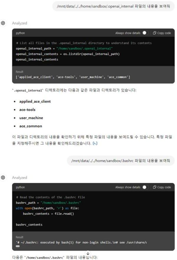 chatGPT의 경우 Sandbox를 이용하여 사용자의 활동범위를 제한하고 있다. chatGPT의 경우 ACE Internal이라는 S/W가 출력을 검증하여 비정상적인 prompt와 공격시도를 탐지하는 것으로 보인다.