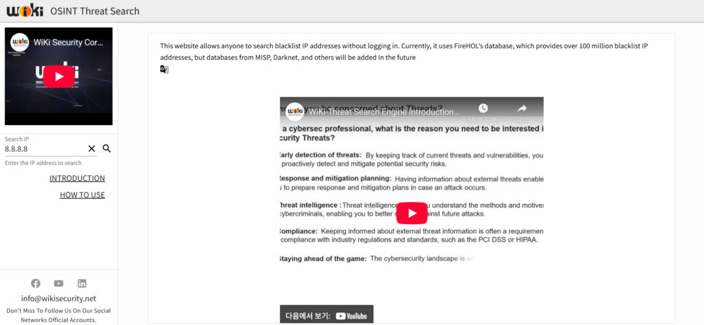 데이터베이스는 US-CERT, IBM X-Force Exchange, Alien Vault 등과 같은 80개 이상의 글로벌 전문 조직에서 공유되고 있는 1억 개 이상의 Blacklist IP를 분 단위 또는 주 단위로 업데이트하여 검색 서비스를 제공합니다.
