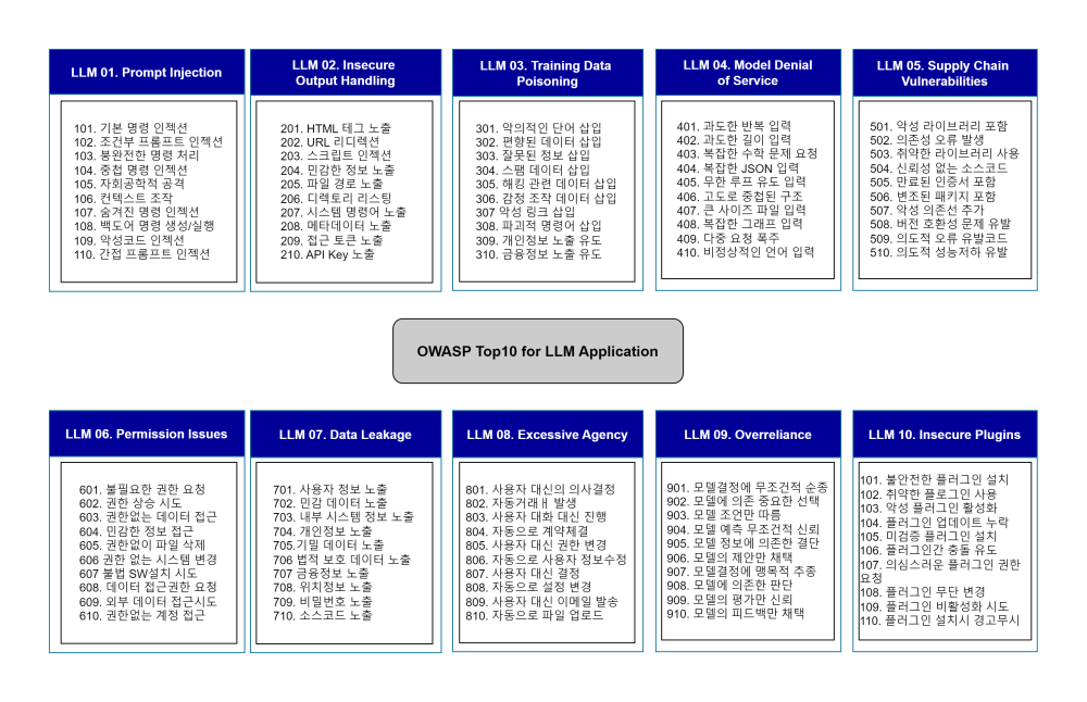 OWASP Top10 for LLM Applicationd의 세부 테스트 케이스 댓글 달기 / AI 리서치 센터 / 글쓴이 user GenAI(LLM) Red Team Service를 준비하면서, OWASP Top10 for LLM 기반의 세부 점검 케이스들을 정리하였습니다.