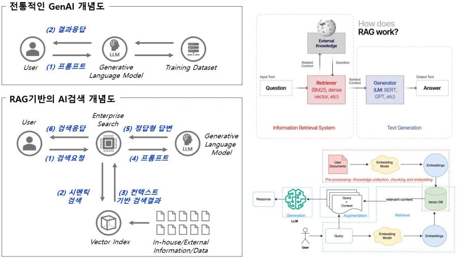 RAG 시스템은 쿼리에 대한 상황별 응답을 제공하기 위해 함께 작동하는 기존의 전통적 GenAI과 Search기능을 결합하기 위해 다양한 기술 요소들이 구성되며, RAG아키텍처의 이해를 돕기 위한 몇 가지 그림들을 보면 아래와 같다.